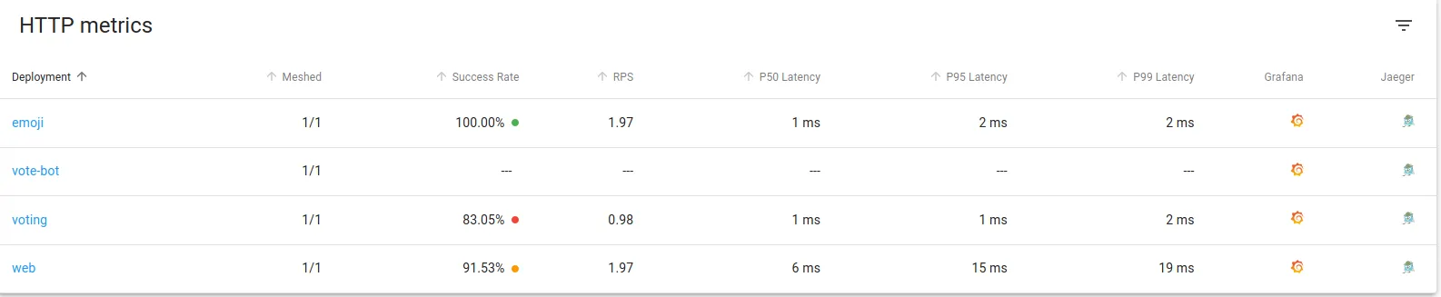 • In the last column, click of the Grafana Icon to access the metrics dashboard for the following deployment.
